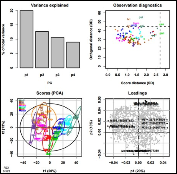 Comments: For a comprehensive analysis of the dataset (starting from the preprocessing of the raw files and including all detected features in the subsequent steps), please see the companion ‘W4M00007_Coffea_leaves’ reference history. |