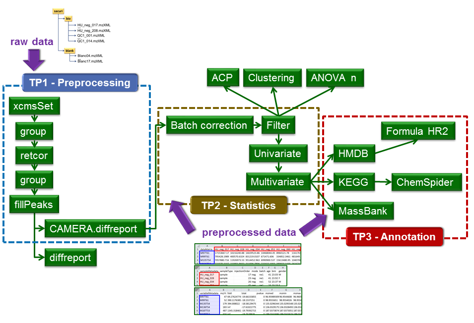 The available modules of the LC-MS workflow can be grouped into three categories: pre-processing, statistics, and annotation (Figure 2). The modules for statistical analysis can also be used with processed data (sample x variable tables) coming from NMR or other "omic" technologies.
