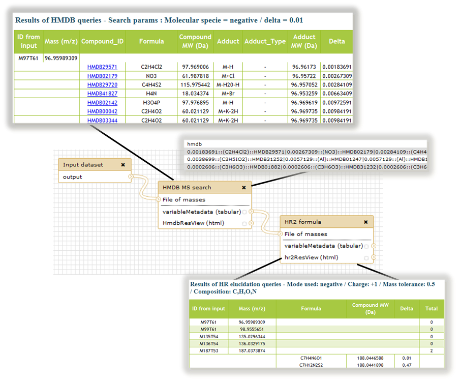 Figure 7 : Annotation sub-part of W4M: Workflow and outputs results views of a possible annotation strategy merging search on a reference bank (HMDB MS search tool) and in silico formula elucidation (HR2 formula tool).