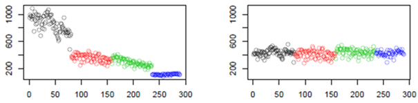 This MS-specific tool is dedicated to data correction from analytical drift, which results in a decline of detection capacity during an injection sequence due to clogging in ionization source. It also corrects the intensity differences due to source cleaning among the different injection sequences (as shown in Figure 5). The Batch correction tool is based on the algorithm mentioned by Van der Kloet ([8]). It corrects inter and intra batch effects using linear or loess modelling of the drift, based on quality control pooled samples injected regularly in the sequence.